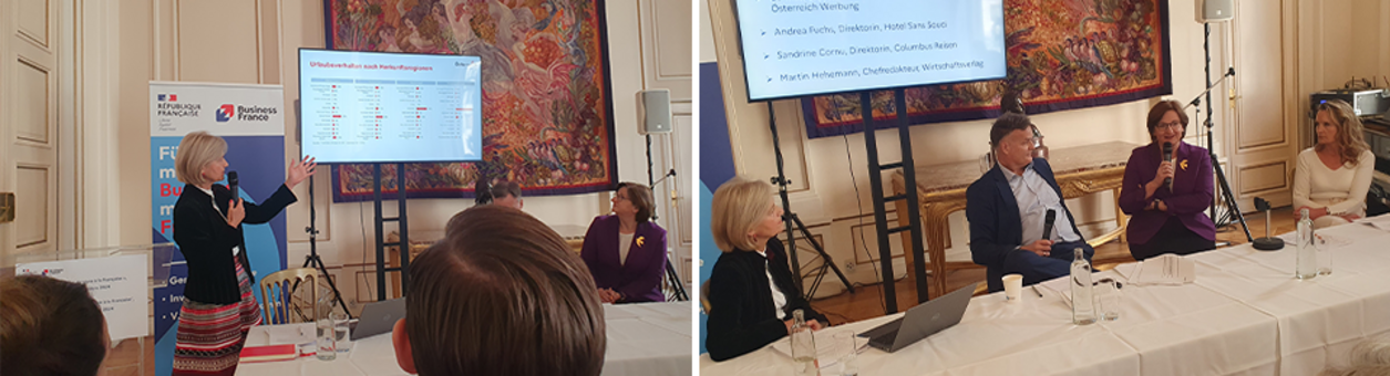 Auf Einladung von Business France Österreich, der Handelsabteilung der französischen Botschaft, präsentierte Carmen Breuss/Österreich Werbung den touristischen Zielmarkt Frankreich, der der drittgrößte europäische Auslandreisemarkt nach Deutschland und Großbritannien ist und 2023 ca. 1,6 Mio. Nächtigungen bei 486.000 Ankünften brachte. Anschließend sprachen Carmen Breuss, Andrea Fuchs/Hotel Sans Souci Wien und Sandrine Cornu/Columbus Reisen über ihre Erfahrungen mit französischen Gästen. Moderation: Chefredakteur Martin Hehemann.