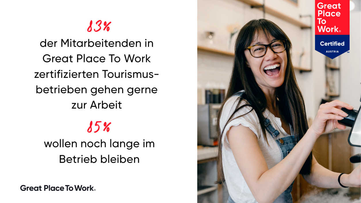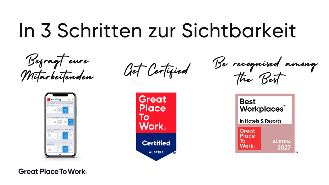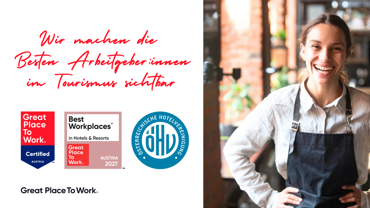 Great Place To Work® macht großartige Arbeitgeber:innen im Tourismus sichtbar und unterstützt Betriebe dabei, ihre Arbeitsplatzkultur gezielt zu verbessern, Mitarbeitende langfristig zu binden und Fachkräfte zu gewinnen. Gerade für Mitglieder der Österreichischen Hotelvereinigung (ÖHV) bietet sich damit die Möglichkeit, die wirtschaftliche Performance zu steigern und sich als Top-Arbeitgeber:in im Wettbewerb um Talente klar zu positionieren.