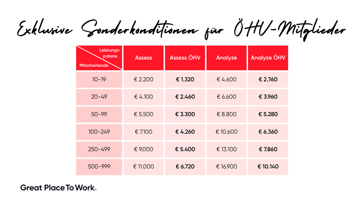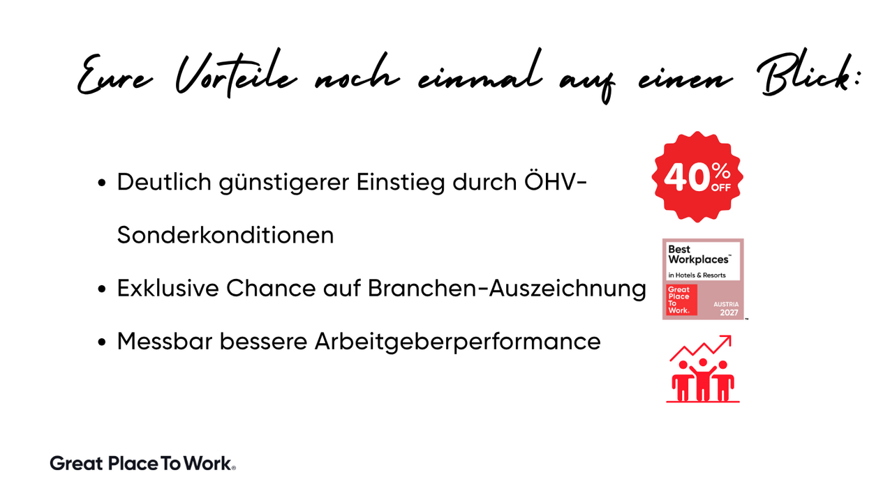- 40 % exklusive Sonderkonditionen auf die Teilnahme am Great Place To Work® Certified™ - Programm