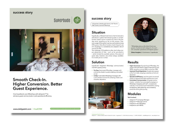 Superbude hebt den Self-Check-In von 20 % auf über 50 % – und übertrifft damit Branchenstandards deutlich. WhatsApp & dailypoint™ sorgen für eine nahtlose, moderne Guest Experience.