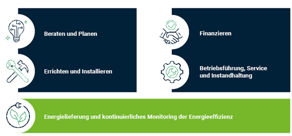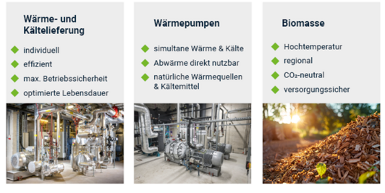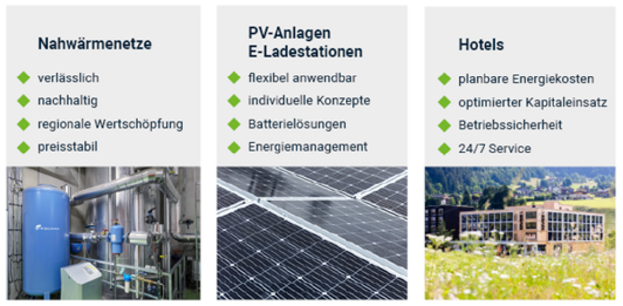 Wir liefern Wärme und Kälte. Mit individuellen Energie-Lösungen und kompetenter Betriebsführung verbinden wir finanzielle Planbarkeit mit effizientem Energieeinsatz. Wir verwenden ausschließlich Energieträger wie Biomasse, Geothermie und Ökostrom und setzen diese mit modernsten Technologien in Ihre maßgeschneiderte Energielösung für die Zukunft um.