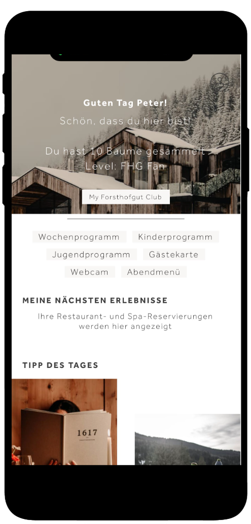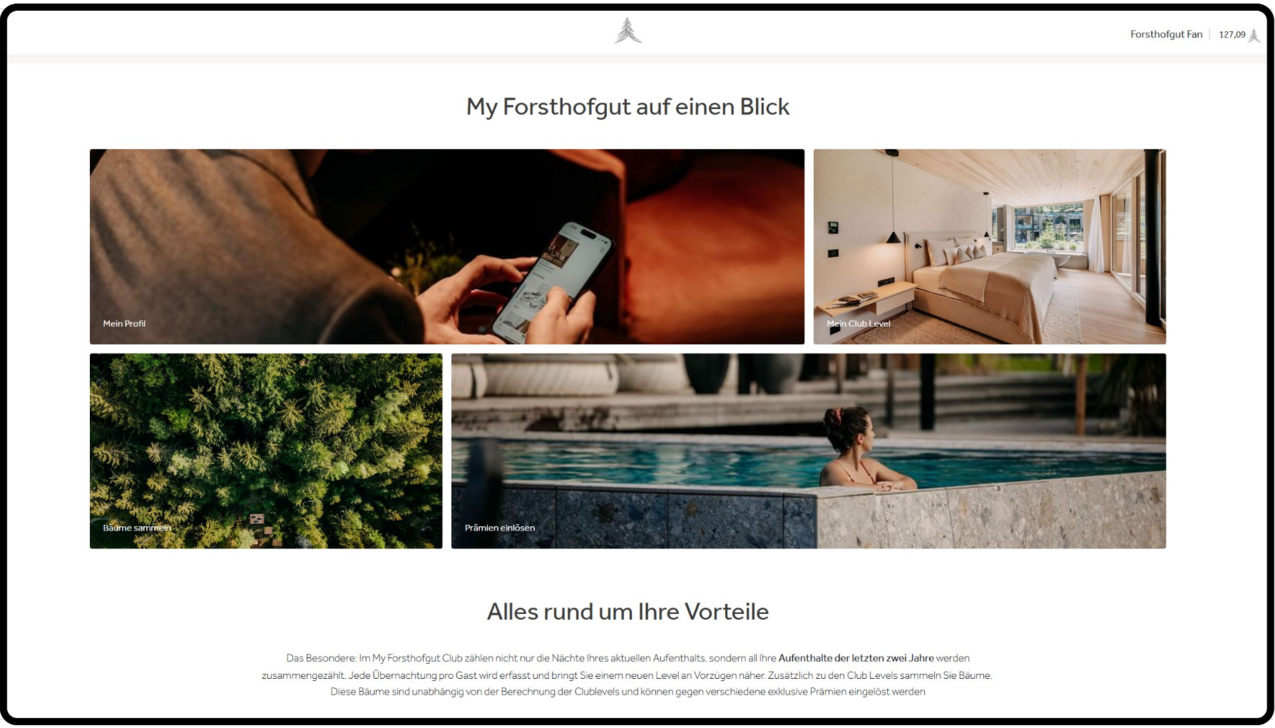 Im November 2024 haben wir zusätzlich den Loyalty-Club „My Forsthofgut Club“ gestartet. Gäste steigen je nach Aktivität vom „FG-Fan“ bis zum „Ambassador“ auf und erhalten exklusive Vorteile. Die Punktevergabe, Kommunikation und Einlösung sind vollständig digitalisiert. Über 8.000 Gäste nutzen das System schon jetzt aktiv und das auch über die Forsthofgut App, über die auch Prämien und Vorteile direkt eingelöst werden können.