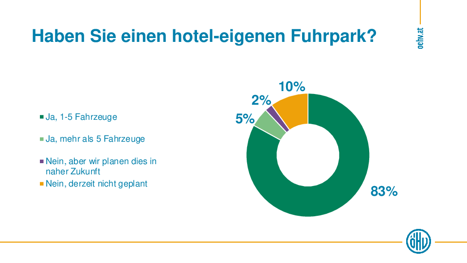 Über 80 % der Hotels haben einen hotel-eigenen Fuhrpark mit 1 - 5 Fahrzeugen, mehr als zwei Drittel davon haben auch bereits E-Fahrzeuge im Einsatz. 16% planen dies in naher Zukunft um die Mobilität für die Mitarbeiter im Alltag zu verbessern und gleichzeitig nachhaltiger zu gestalten. Darüber hinaus gelingt es den Hotels, mit der Einführung von E-Fahrzeugen nicht nur ökologische Ziele verfolgen, sondern auch ihre Attraktivität als Arbeitgeber zu stärken. Moderne Mobilitätslösungen, wie etwa Poolfahrzeuge oder E-Bikes, sollen den Mitarbeitenden helfen, Wege zwischen Arbeitsstätte, Aufgaben im Arbeitsalltag und privaten Erledigungen effizienter zu bewältigen.