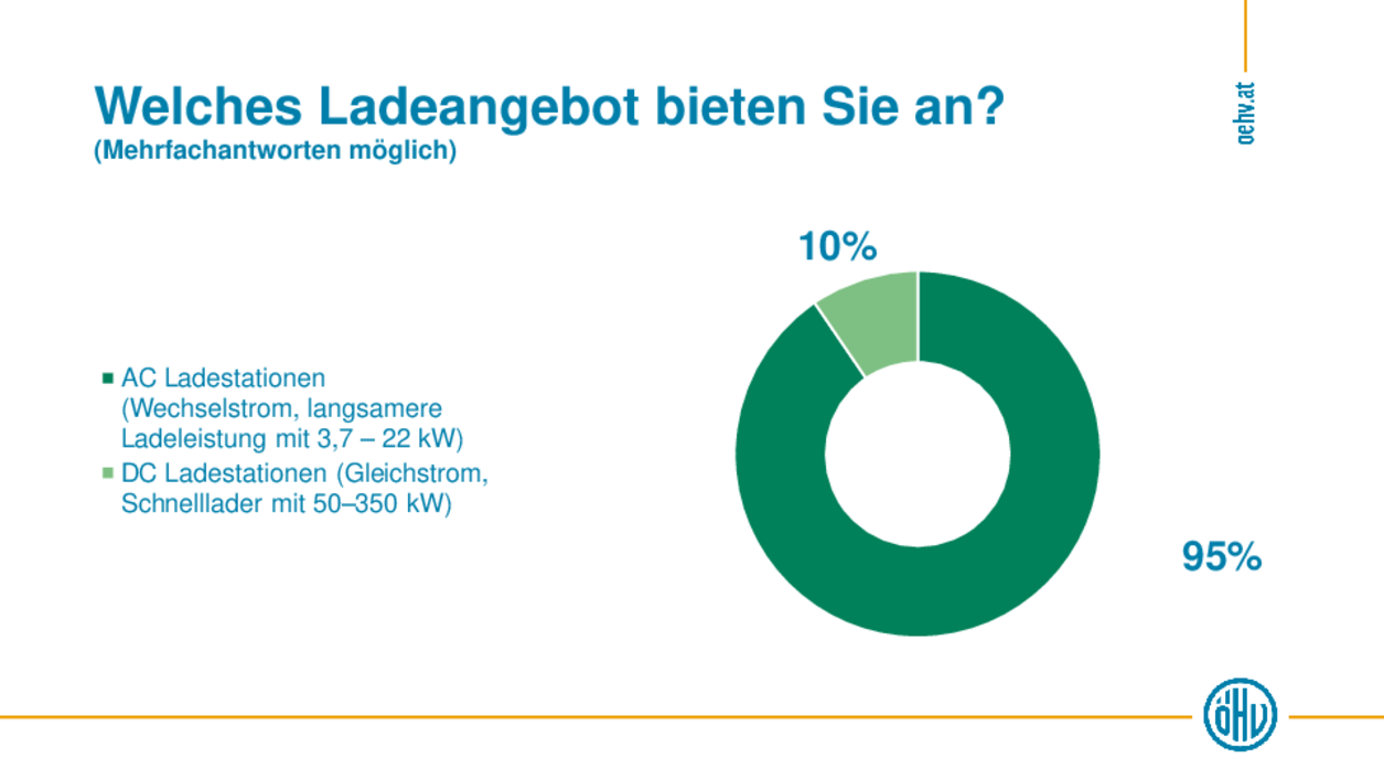 Ein Großteil (95%) der Hotels bietet Ladeleistungen bis max. 22 KW (AC Ladestationen mit Wechselstrom), Schnell-Lader (DC Ladestationen mit 50 - 350 kW, Gleichstrom) sind noch nicht viele an den Hotelstandorten im Einsatz.