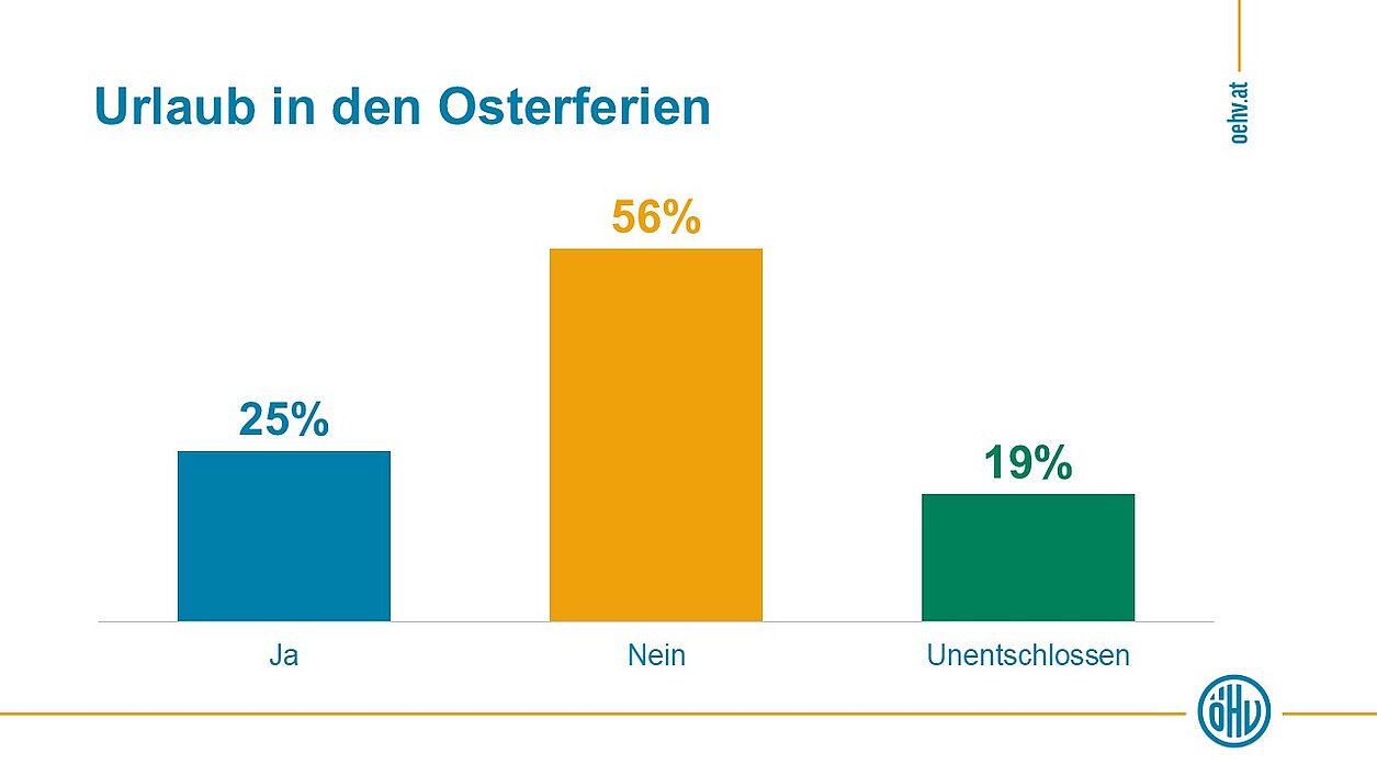 Für den aktuellen ÖHV-Urlaubsradar hat die Österreichische Hotelvereinigung gemeinsam mit Reppublika rund 1.000 Österreicher:innen zu ihren Plänen für die Osterferien befragt. 2026 geben 25% an, zu Ostern zu verreisen, 2025 waren es 26%, 2024 28% – nach einem leichten Hoch vor zwei Jahren hat sich die Reisequote auf einem stabilen Niveau eingependelt. 56% bleiben heuer zuhause, 19% sind noch unentschlossen. Das bestätigt den Trend der vergangenen Jahre: Die Lust auf Urlaub ist da, Entscheidungen fallen aber zunehmend kurzfristig und bewusster.