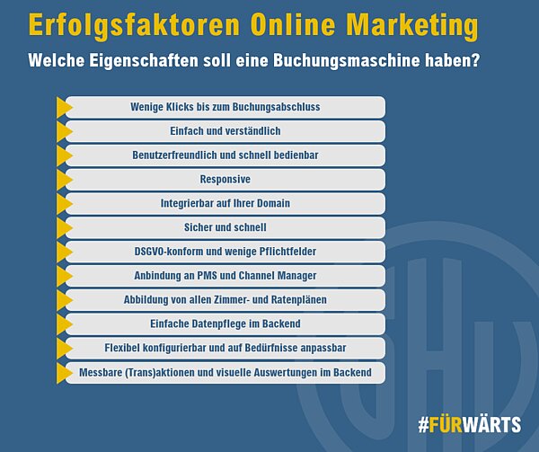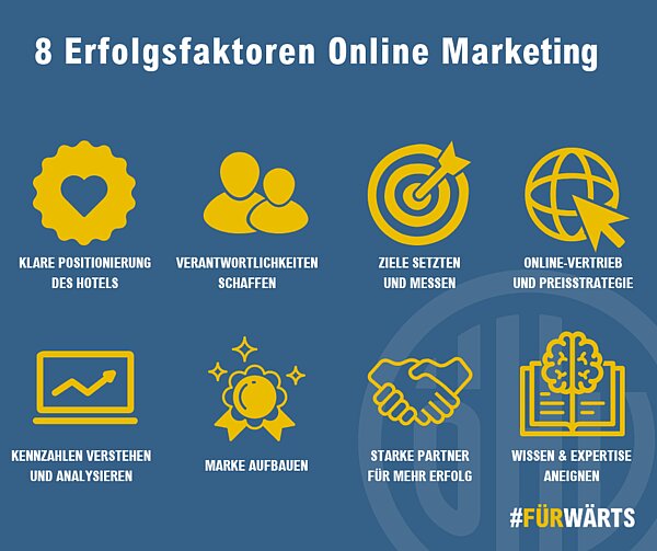 Erfolgreich im Online Marketing sind jene Hotels, die klar positioniert sind, Verantwortlichkeiten im Betrieb aufgeteilt haben und die vorab gesetzten Ziele stets im Auge haben und messen. Dabei liegt der Fokus auf der Online-Distribution unter stetiger Kontrolle, Analyse und Optimierung der Kennzahlen.