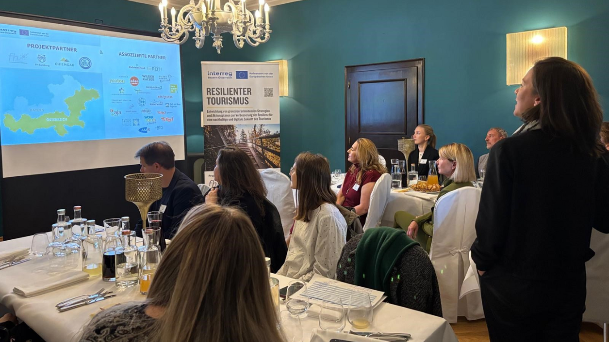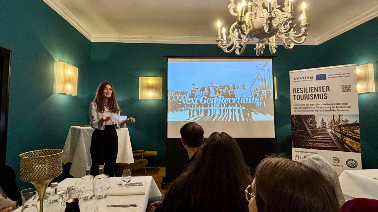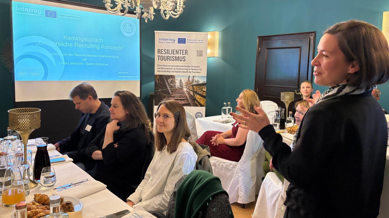 Linda Lorenzoni, Gründerin von Gastro Exclusive, unterstützt Betriebe mit einem Pool an engagierten Schüler:innen und Student:innen. Beim Interreg-Kamingespräch mit interessierten Hotelier:innen gab sie spannende Einblicke in die Erwartungen und Arbeitswelt der jungen Generation.