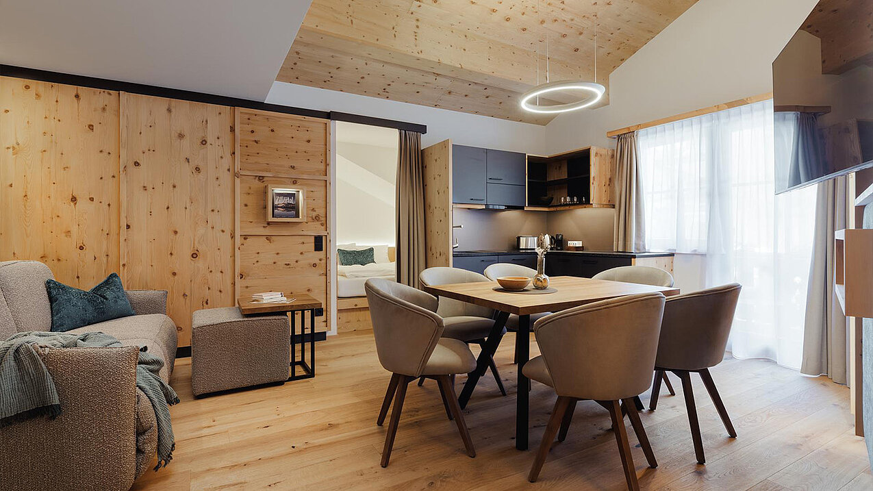 Den Grundstein für die Transformation legte Gastgeber Johannes Geiger 2019 mit einem Businessplan, den er im Rahmen eines Diplomlehrgangs entwickelte. Er fragte sich: Wie will ich selbst Urlaub machen? Welche Trends prägen die internationale Ferienhotellerie? Und: Was fehlt aktuell im Zillertal? Die Antwort: gewerbliche Ferienapartments, die den Service und die Annehmlichkeiten eines Luxushotels – Wellness, À-la-carte-Gastronomie, persönliche Betreuung – mit der Unabhängigkeit und Privatsphäre einer Ferienwohnung verbinden.