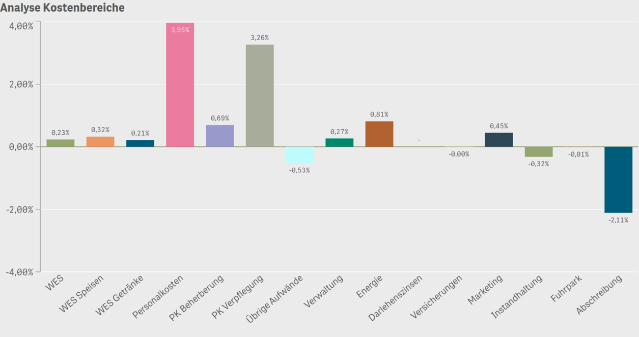 Grafik: Im DiGi pOiNT-Dashboard werden alle Kostenbereiche wie Wareneinsätze, Personal, Energie, Zinsen oder Abschreibungen, usw. dargestellt. Jeder Balken zeigt die prozentuelle Veränderung im Verhältnis zu einer Kennzahl wie z.B. Auslastung oder Umsatz. Positive Balken bedeuten gestiegene Kosten, negative Balken Einsparungen. So werden die Handlungsfelder des Betriebs auf einen Blick sichtbar!