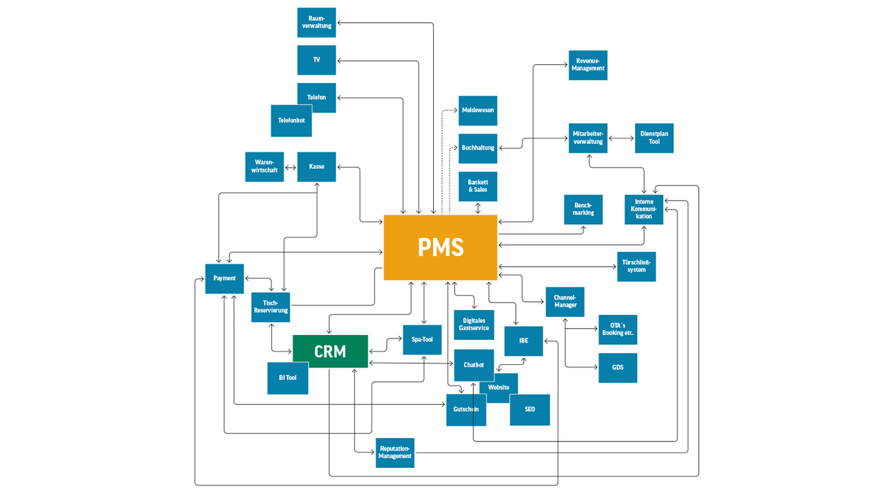 Hier sehen Sie ein Beispiel für eine Hotel-Systemlandschaft. Bitte beachten Sie, dass die Darstellung je nach Typ und Größe des Hotels bzw. den eingesetzten Tools variiert. Damit keine Datensilos entstehen, sind die Verbindungen zwischen den Systemen entscheidend. Aber: Schnittstelle ist nicht gleich Schnittstelle. Machen Sie sich klar, ob es sich jeweils um eine 1-way-Schnittstelle oder 2-way-Schnittstelle (Austausch in beide Richtungen) handelt!