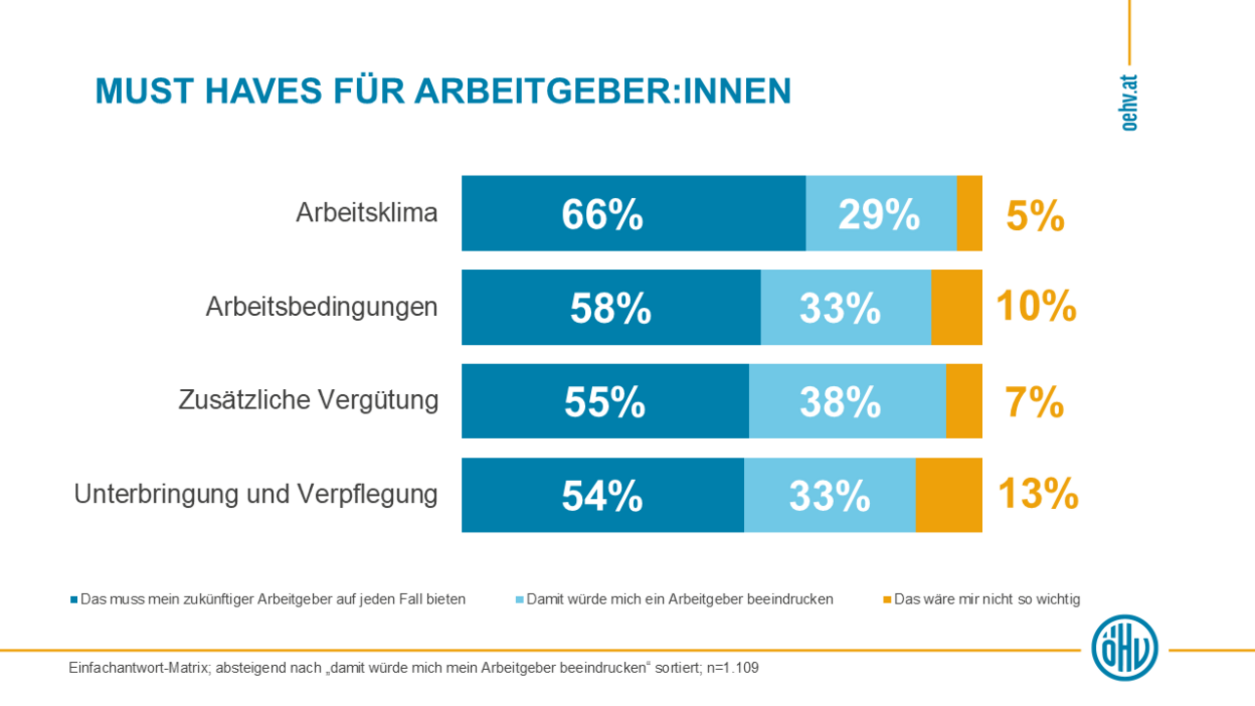 Die Branche steht also gut da, muss aber natürlich – wie andere auch – ihre Hausaufgaben machen. Genau da setzt die ÖHV-Initiative an, so Gratzer: „Wir wollen Optimierungspotenzial aufzeigen, um besser zu werden.“ Dieses Potenzial orten die Schüler:innen vor allem bei der Kommunikation und der Einhaltung der Dienstzeiten. Zwar sind auch hier die meisten Betriebe gut aufgestellt, bei einem Drittel sehen die Schüler:innen aber Luft nach oben. Ein Wert, den Gratzer – auch wenn er besser ist als im Vorjahr – weiter verbessern will: „Wir müssen das ernst nehmen. Attraktive Arbeitgeber müssen Beschäftigten auch die Zuverlässigkeit bieten, die sie von ihnen erwarten. Planbare Arbeitszeiten gehören unbedingt dazu.“ Auch Work-Life-Balance, Bezahlung und der Arbeitsdruck entsprachen nicht durchwegs den Erwartungen der Jugendlichen.