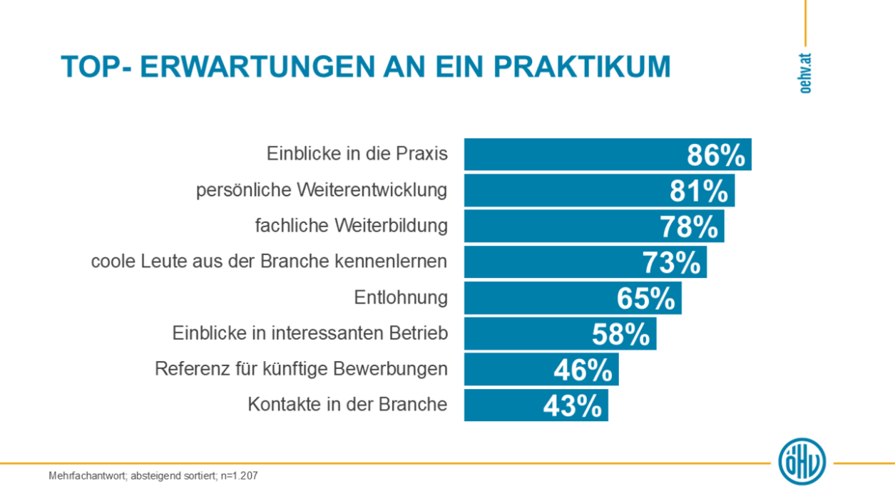 Am meisten gefielen den Praktikant:innen das Kennenlernen der Kolleg:innen und der Gästekontakt, Neues zu lernen und Verantwortung zu übernehmen. 76% würden den Praktikumsbetrieb weiterempfehlen, 80% durchaus in der Branche bleiben, 27% in jedem Fall: eine klare Steigerung zum Vorjahr. „Das sind sehr erfreuliche Ergebnisse – die Maßnahmen und Aktivitäten der Unternehmen zeigen Wirkung. Jetzt gilt es, konsequent weiterzumachen und diese Entwicklung mit voller Kraft voranzutreiben“, erklärt ÖHV-Generalsekretär Dr. Markus Gratzer.