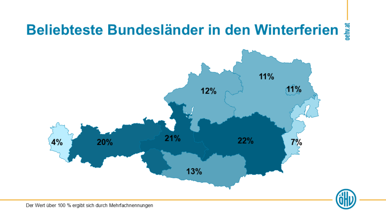 Steiermark, Salzburg und Tirol liegen als Reiseziele in den Winterferien klar vorne, gefolgt von Kärnten und Oberösterreich. „Das Angebot in den Winterregionen trifft den Nerv der Gäste und ist entsprechend beliebt“, so Veit. Aktiv- und Erlebnisurlaube – allen voran Skifahren – dominieren die Winterferien, gefolgt von Erholungs- und Wellnessurlauben.